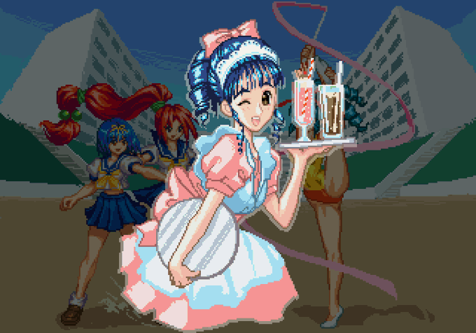 X6800版クリアエンディングの絵って元に七瀬さんのイラストがあってスキャンして640×480くらい?にして減色してドット修正したやつなのかな? この久美ちゃんかわええよな~ それの50%くらい縮小した縦横倍ドットのデカい状態で模写。模写なのでバランスは違うかもだけどw 腰から下は想像