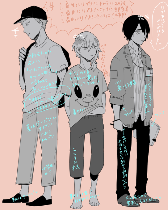 遅くなりました>< #1番目にリプきたキャラに私服2番目に部屋着3番目に仕事服着せる