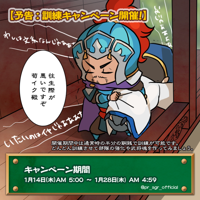 昨日お伝えした訓練機能の改善を記念して、キャンペーンも開催するそうです♪通常の半分の銅銭で訓練が出来る&ログインボーナスでたくさん銅銭が貰えますよ!(๑•̀ㅂ•́)