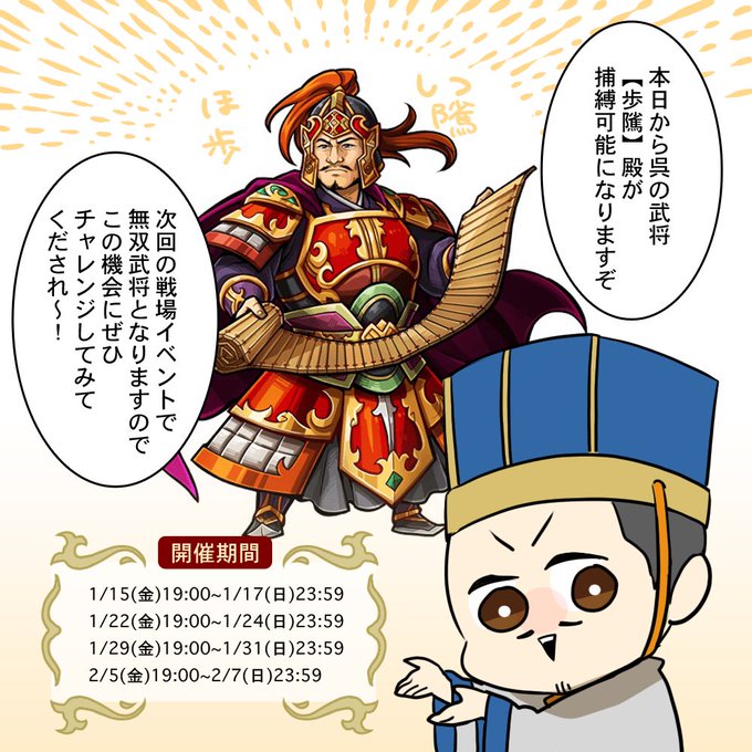 本日19時から戦書イベントが始まりますよ~今回の★4武将は歩隲殿!今回がサンロワ初登場だそうですヽ(•̀ω•́ )ゝバトルスキップ機能を使えばいつもより楽に捕縛出来るかもですね♪