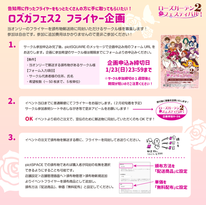 ご協力いただける参加サークル様へ当オンリーのフライヤーを郵送し、頒布物と一緒にお送りいただく企画です!詳細は画像をご確認下さい。企画参加に追加費用はかかりませんので、是非お申込みください!ご質問は質問箱へどうぞ→https://t.co/1rAPGrSHeB