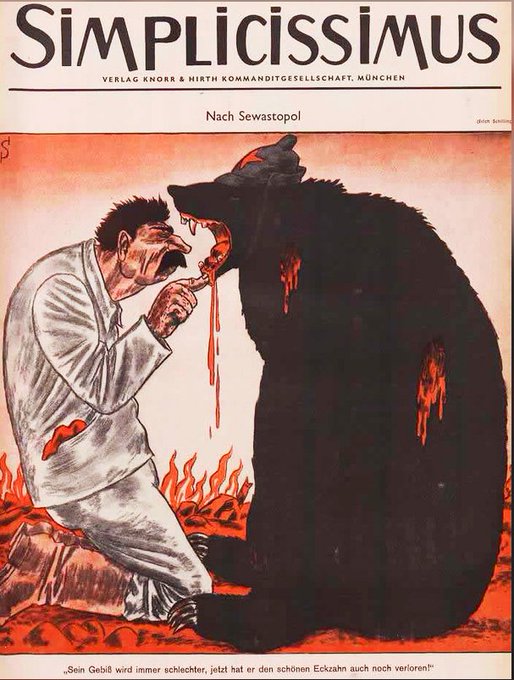 "His teeth are getting worse and worse, and this time he even lost his pretty fang!" – 🇩🇪 anti-Soviet illustration from Nazi Germany showing Stalin inspecting a wounded bear’s teeth.