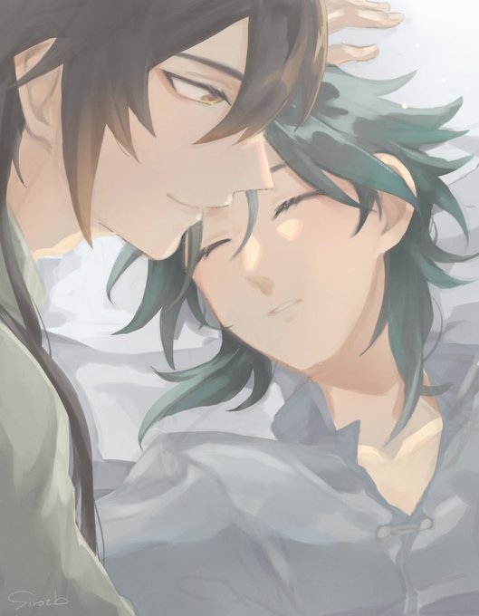 夏コスイメージの鍾離先生と魈くんらくがき 原神ver1.6楽しみだな〜