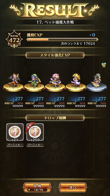ということでバーニィ本日分クリアー。お疲れ様でした😄 午後からは4-1-5周回でバーニィ鍛えつつオーラム貯めるぞー💰 あと、朝は Aファティーマ Aアスラ Aレオニード でした。きょうじゅ〜‼️ #ロマサガRS