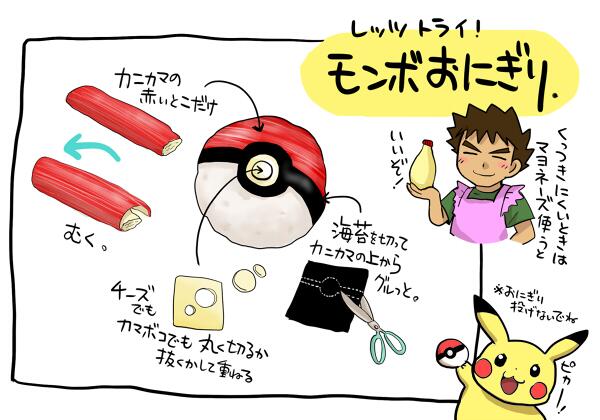 モンスターボールおにぎり、何人かに質問もらったから作り方(っていうか材料くっつけただけ)。剥がれてきてもラップ巻いちゃえばダイジョーブ!