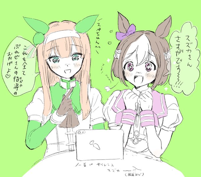 ウマ娘ガチ勢だということを知ってかフォロワーさんの同居人からハーフアニバの引換券を何にするか相談に乗ったのですがなんとそのお礼にとスペスズ絵を描いてもらいました!!めっちゃかわいくて緑と紫の色合いやハート飛ばし合ってるとこがお気に入りです!名前もうれしい!ありがとうございます!!