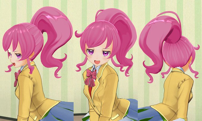形がよくわからない巨大ポニテ、とりあえず公式ポニテをグニャグニャと曲げて作ってみた。ウェイトに無理あるから動くと形が崩れる・・・後髪は南委員長の改造でいいかな。りんか用の素材を物色しつつ動作チェック。えもちゃんは作画のふにゃっとした感じにしたいけど難しい。