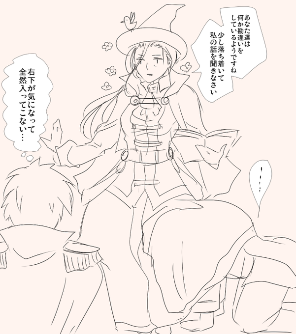 女装オウガ落書き。 オウガ「赤獅子も男だねぇ」 主人公「……!」 アイリス「見ちゃダメぇえええ!!」