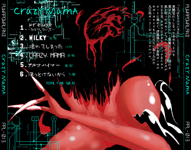 ジャケの表裏。赤を基調としたシンプルなデザイン。サウンドが今までのpuwapowalandの中でも最先端を行っているようななかなかキチガイな音をしているようなすごいサウンドにできた思うけど歌がまた今までよりポップでエモーショナルでいいメロディにできたんじゃないかと思うような最高傑作である💩