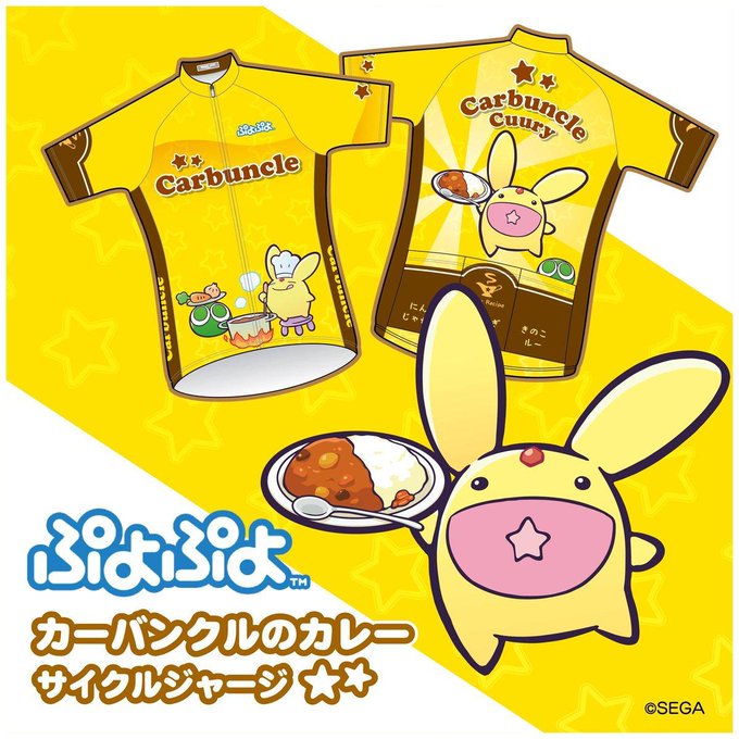 『카방클의 카레 반소매 져지(半袖ジャージ ぷよぷよ カーバンクルのカレー)』 상품은 「카방클과 카레」 테마로 만들어졌으며, 져지 뒷면엔 카레 재료가 적혀있는 옷이다 뿌요. 가격은 세금 포함 14,850엔이다 뿌요.