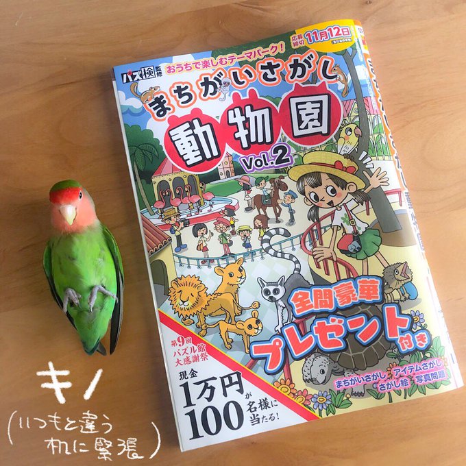 コンビニ限定発売『いきもののまちがいさがし』Vol.1にて、コザクラインコとスズメの2問を描かせて頂きました