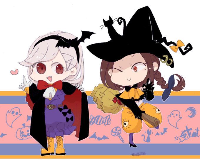 ゆーきさんとこの姫百合くおんちゃん(左)と、うちのユリエー(右) ハロウィンコス!くおんちゃんが吸血鬼的ななにかとお聞きしたのでドラキュラ、ユリエーは魔女っ子的なあれ~ ちっちゃい子がわちゃっと装飾つけて立ってる絵はなんかこう・・いいのう(語彙力)ちょこちょこ飾りつけるの楽しかった