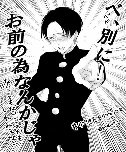 ユウグレさん[@yu_gure37458 ]から「べ、別にお前の為なんかじゃ……/////」なツンデレ兵長でしたっ!巨中気味で中の人ネタですみません…(∩´﹏`∩)!!楽しかったです!