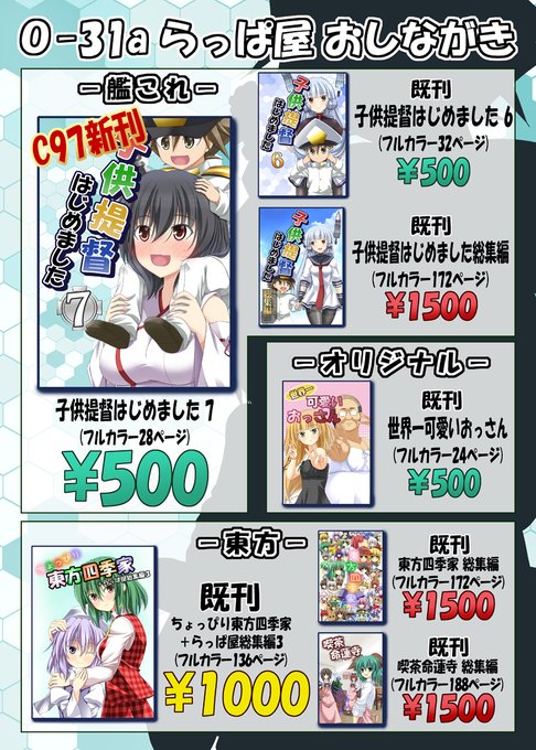 C97おしながき。 全種、全ページフルカラーの本となります。 十分な数を持ち込む予定なので慌てずごゆるりと来ていただいて大丈夫ですが、14時以降は怪しいかもしれません。 おっさんの本だけは書店様への委託は行っておりませんのでご注意を。 2日目 日曜日 西地区“O”ブロック-31a らっぱ屋 です!