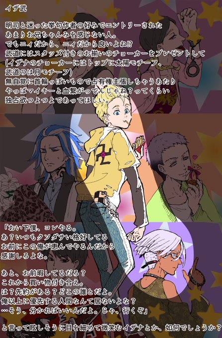 オニイサンモットガンバッテ〜♡取り敢えずここまで出来たのであげときます。お兄さんズからいろんなプレゼントを貰ったりデートしたりする🎍の妄想です。#スマ武 #蘭武 #寿武 #みつ武 #真武 #イザ武
