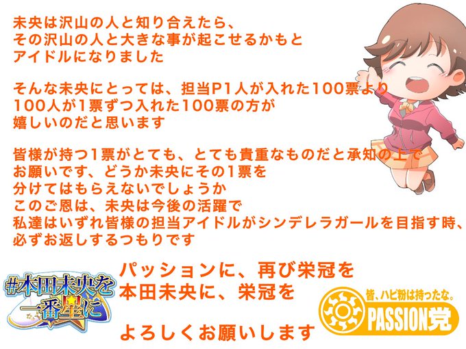 あと選挙ポスターと今回の総選挙にかける思いを少し。勝手に投票企画の事とか書いてますが、問題あったら消しますので…! #第7回シンデレラガールズ総選挙 #本田未央を一番星に #本田未央