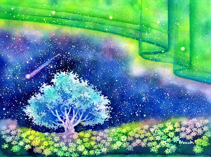 新作水彩画 ”星の声” オーロラの星空に輝く星の木と虹色の花たち。星の声が聞こえてくるようなそんなイメージで描きました。https://t.co/3nj2kSZEi6