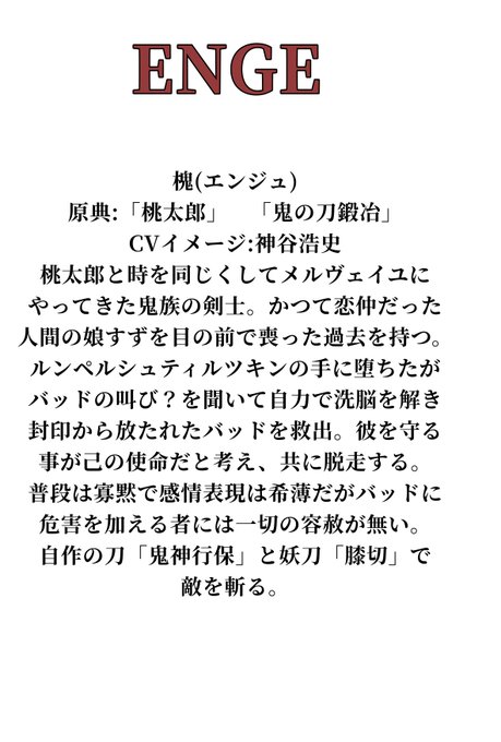 桃太郎と同じ世界からやって来た鬼族の侍。類稀なる剣技の持ち主。普段は寡黙だが、バッドを傷つけようとする者には決して容赦はしない。