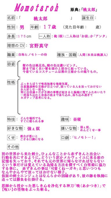 別の世界からメルヴェイユにやってきた侍。メルヴェイユに来る前の記憶を失くしている。元の世界へ戻る手がかりを探すべく、ひょんな事から赤ずきんと行動を共にする様に。ぶっきらぼうで俺様気質だが、困ってる人を放って置けないお人好しな部分も。神刀「暁」で敵の悪しき心をぶった斬る。