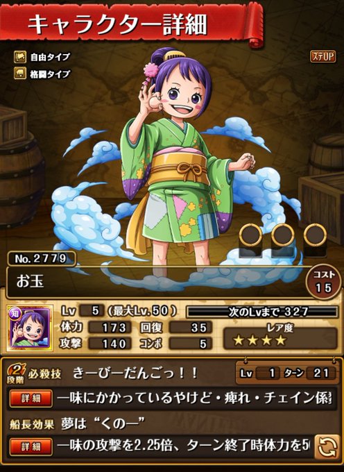 トレクルくん石50個くれたからガチャ引いたらバレットが来た!お玉も来てくれたし確定枠はウソップだった(˘ω˘)40連でフランキーしか出てなかったし良かった良かった