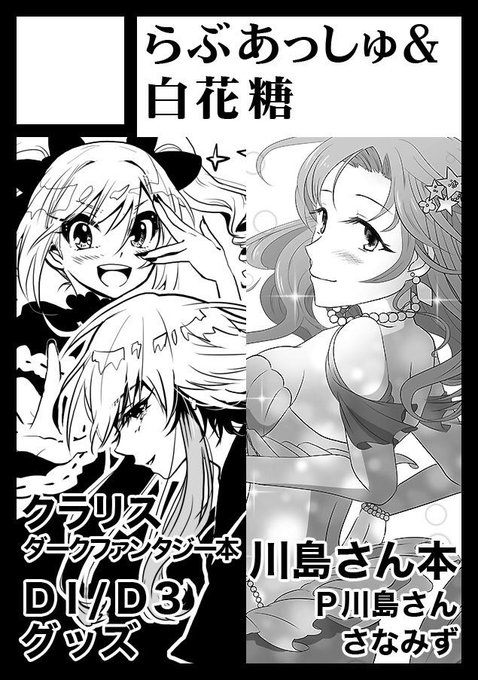 夏コミ申し込みました!いつも通りモノコさん(@1015monoko )と合同サークル!カットの川島さん素敵すぎてヤバイ…。肩…!肩のヒラヒラ…!(好き)春に予定が詰まってるのでクラリスさんの新刊はあるかわかりません…ので、ダークイルミネイトとDimension-3グッズ推しのカット!(既存)受かると良いな〜