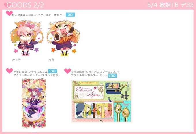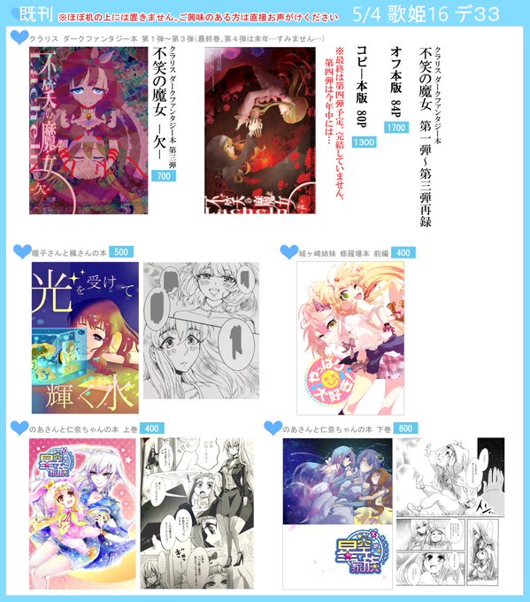5/4歌姫16【デ33】らぶあっしゅ&白花糖で参加します!いつも通りモノコさん(@1015monoko )と合同サークルです。新刊や新グッズはありませんが、クラリスさんの第1弾〜第3弾の再録のオフ本を作りました。シンステで作ったコピー本版再録より高めになっています。(最終章は第4弾予定)