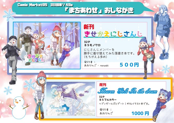C95おしながき* 「まちあわせ」3日目東ソ49a 新刊「きせかえにじさんじ」出ます。 公式の服と、妄想で着せた私服等を混ぜた感じの落書きイラスト本です。もちがえる多め。よろしくお願いします(^O^)/ #c95
