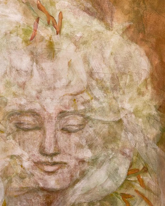 小器用にまとまった、インパクトのないつまらない画面になっていたので、岱赭と錆茶の粗めの粒子を混ぜて全体に乗せて壊しました。斜めに立ててやって絵具を少し流してマチエール形成。