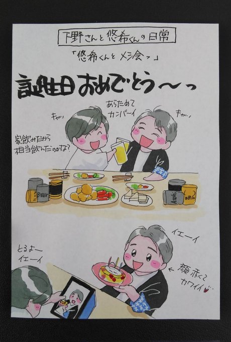 下野さんと梶くんの日常 「コツコツふたりで製作」 まだなのね… 早く見たいけど…ふたりが楽しんで作ってるなら…その時間はふたりにとって色んな話も出来て食事もとったりして有意義な時間なんだろうから…おとなしく…想像して待つとするか…(*´ω`*) #下野紘 #梶裕貴 #イラスト #しもかじ 返信無