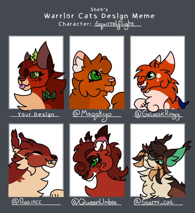 The Squirrelflight designs! I enjoyed drawing them, the designs belong to @maqakyo @GalacticRingy @Ratincc @QueenUmbra and @Starmi_cat! I hope you like it! :]