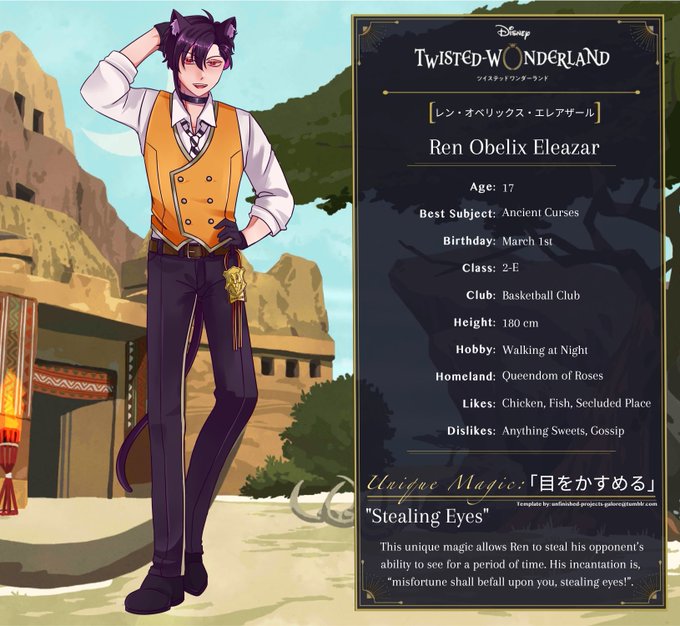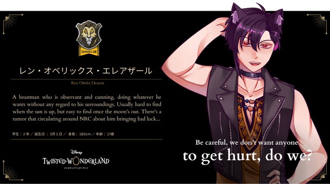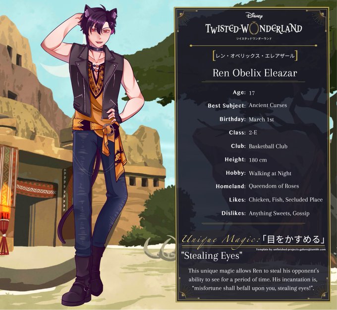 Ren Eleazar is a second-year student in Savanaclaw. He is usually hard to find when the sun is up, but easy to find once the moon’s out. Observant and cunning, he does whatever he wants without any regard to his surroundings.