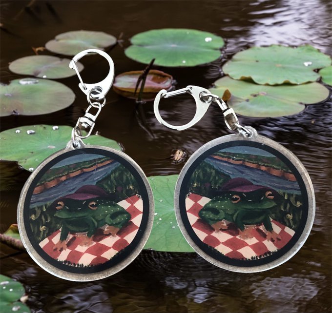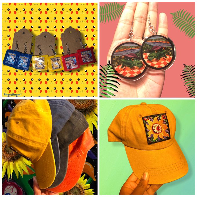 Sunflower patch caps, polymer clay earrings, frog earrings are brand new! Plus stickers, art prints & keychains!