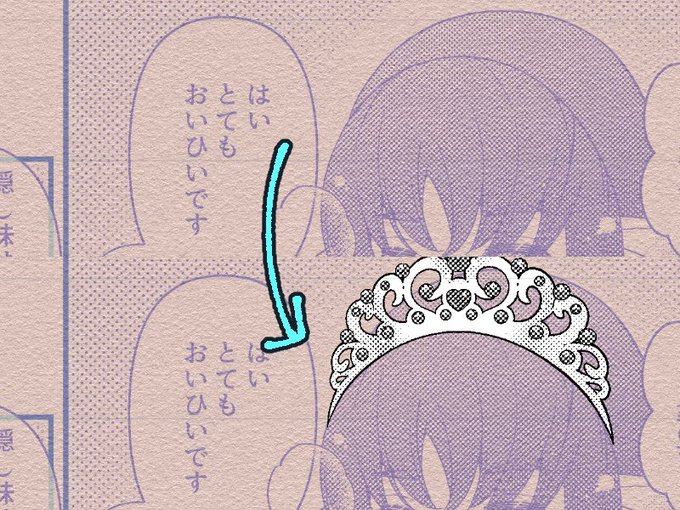 今回、セーリアちゃんのティアラが面倒く…いや、綺麗に描きたかったので、別で描いたティアラを「ファイルオブジェクト」って機能を使って読み込む(わかりやすく色を変えてあります)