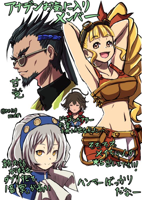 いつもFGOばっかりだから たまにはアナデンのラクガキもしたいのでお気に入りメンバーを。 マジでメイちゃんの☆5化お願いします! ・・・特大打攻撃、物理防御50%ダウン付与とかつけて・・・ #アナデン #アナザーエデン