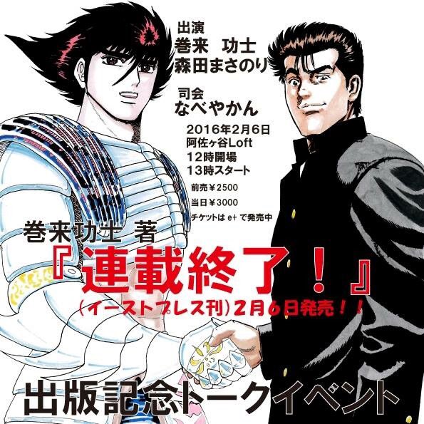2月6日阿佐ヶ谷ロフトにて、巻来功士先生と森田まさのり先生のトークライブがなべやかんさん司会で13時より開催します!ヤバイ話しか飛び出さないと思います。