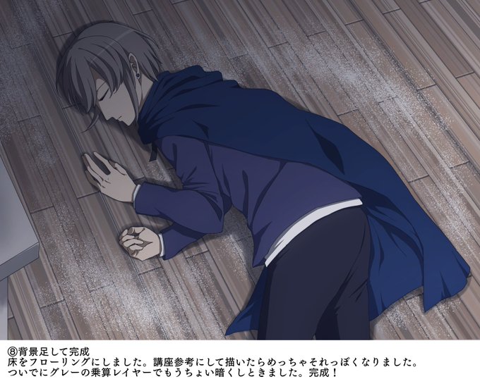 ⑧床がフローリング指定だったのでこちらの講座(https://t.co/0Qzc7aAIBn)を参考に描きました。あまりに便利すぎでは?もうちょっと画面暗くして完成です。背景描くだけですげーそれっぽい!