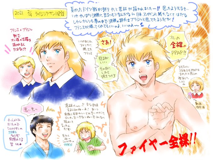 ライジングサン119話の感想絵…どうも今晩中には出来上りそうもないので、2017年ドイツ戦が始まる寸前に描いた「裸踊り」の約束漫画を再掲😅💦裸踊りは結局シュナイダーがやったけどB・ミュンヘンに若林が来る事は実現しちゃったね。ビックリ~💦
