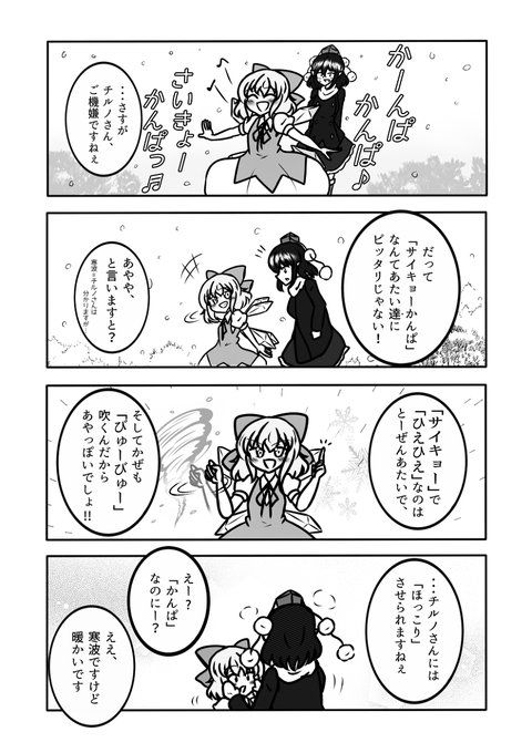 さいきょーかんぱ。 #漫画 #東方 #チルノ #射命丸文 #文チル #最強寒波 https://t.co/CLxEj9bVN0