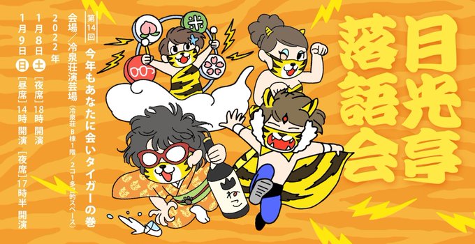 明日1/8(土)・1/9(日)は、第14回 月光亭落語会「今年もあなたに会いタイガーの巻」!すでに8日(土)18時と9日(日)14時は予約満席とのこと。当日券があるかもしれませんが、1/9(日)17:30夜席はまだ間に合いそうですので、予約お忘れの方はお急ぎください! https://t.co/gEq1RkjHxz
