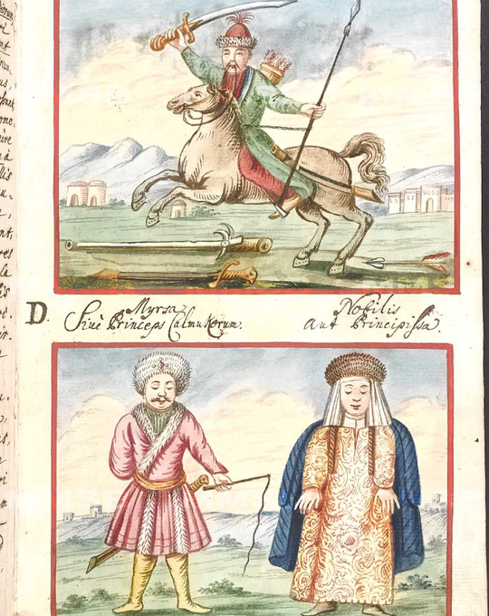 Kalmyks are a West Mongol nation and the original descendants of Mongol tribes. The Jesuits worked missionarily with them during the 18th century. One of them recorded scenes from their lives (clothes, hair, bows, yurts, the alphabet and others).