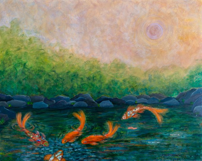 "Koi For Love" by Julia Underwood is an exquisite rhythmic painting with vibrant jewel-tone colors and dynamic patterns. Her nature-inspired paintings. radiate joy and positivity and represent her vast knowledge and use of Feng Shui principles. https://t.co/2yWi2grH7c