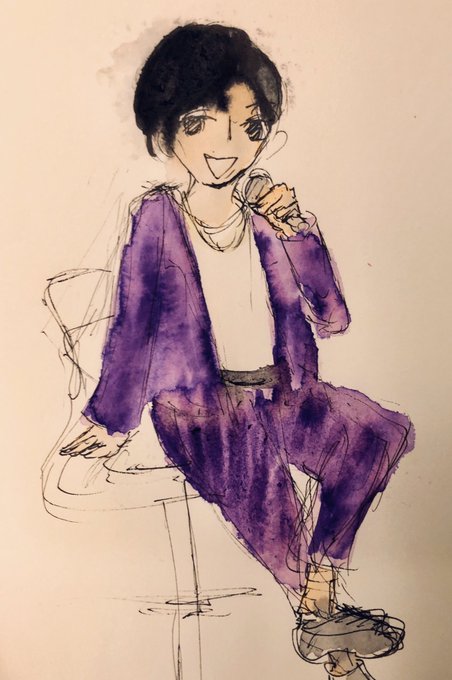 トークショーでの服装。紫のセットアップにシャツ白。黒の英字入ったベルト。足首がチラッと見えてました トーク座席は白で半分ほど座ってリラックスしてましたねー