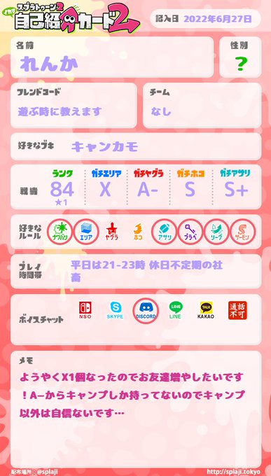 久しぶりにタグやらせてくれ! 3に向けてお友達増やしたい!ので! ゆっくり気になった人フォロー行きます #スプラトゥーン2自己紹介カード #スプラトゥーン絵描きさんと繋がりたい #スプラトゥーン2してる人と繋がりたい