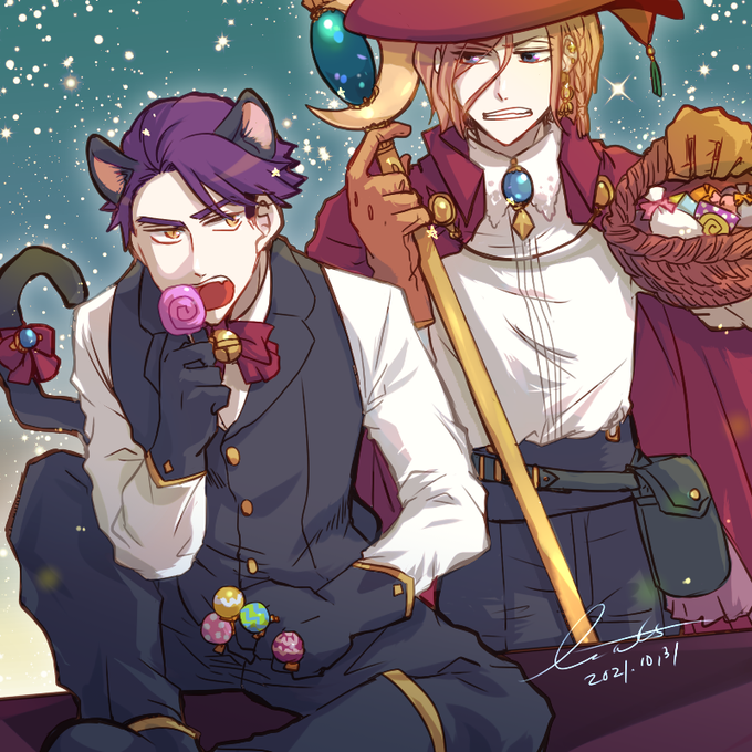 ハロウィン 黒猫十座と魔法使い万里で描いたよ