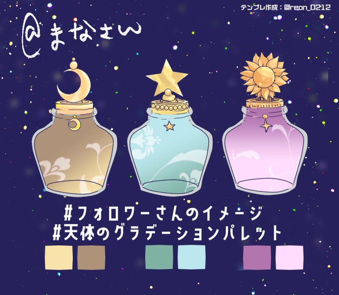 #フォロワーさんのイメージ #天体のグラデーションパレット #カラーパレット 6色を選び、2色ずつグラデ―ションにして小瓶に詰めたいと思って作った。月、星、太陽の小瓶があります。 2枚目透過PNGのテンプレです。 フォロワーさんとの交流にも使っていただけたら嬉しいです。