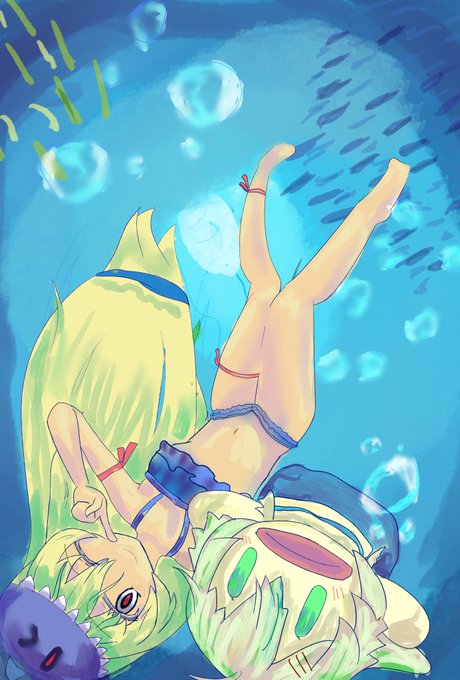 よし!元の寝そべり構図でフリル水着もローレグアンダーも太もももカモちゃん先生(によく似た)パペットもバッチリ入った!