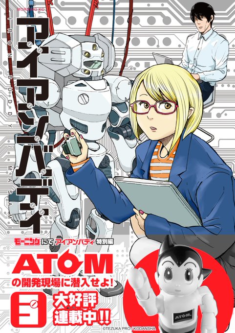 明日21日「アイアンバディ③」発売です! 「ATOMの開発現場へ潜入せよ!」にて取材中の三戸さんが表紙。 帯でATOMも応援してくれてます!