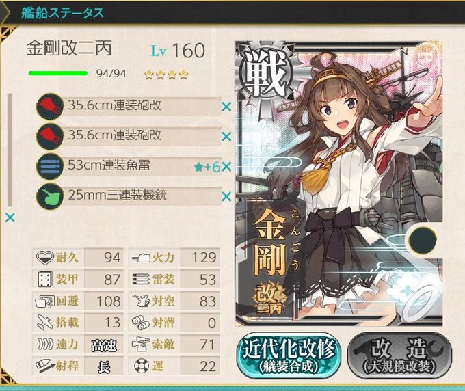 金剛改二ヘーイ!かわいい! 演出凝りすぎててずるいかわいい… んー…魚雷や瑞雲詰まないでも良さげなんかな?