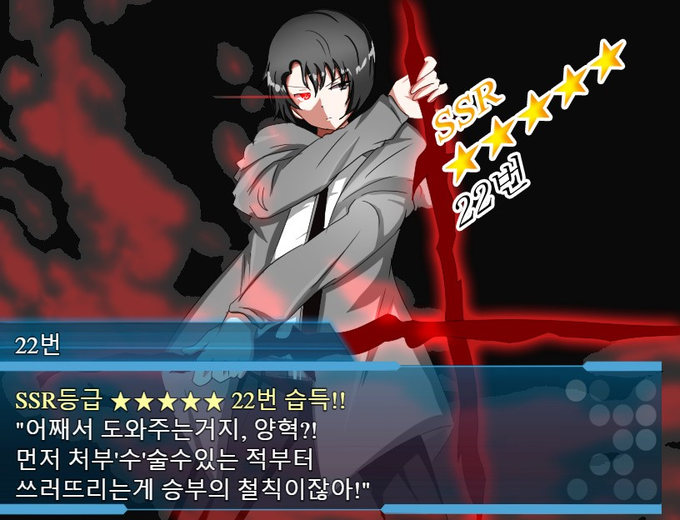 K-RMGU에서도 희귀 이상의 캐릭터는 가챠 일러스트를 넣어줄까 했었습니다만... 아무래도 작업량이 엄청 많아지다보니 못했던 부분이 있었겠지요. 정작 거울소녀 C에서는 저런식의 가챠 연출이 있었지만... 후새드...