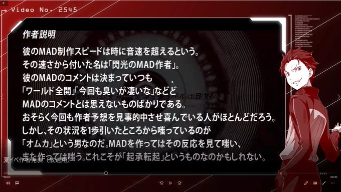 さてさて、改めまして今年の夏mad祭にも参加させていただきました。ネームレスイベントなのになぜかすぐバレちゃいましたけどその反応も含めてめちゃめちゃ楽しかったですw今回も参加させてくれた垢さん、他、全てのmad作者に感謝!